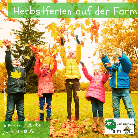 In der ersten Woche der Herbstferien bietet die Kinder- und Jugendfarm betreute Ferienspiele für angemeldete Kinder an. Die Plätze hierfür sind bereits ausgebucht und das Farmgelände bleibt für die weitere Öffentlichkeit in dieser Zeit geschlossen.